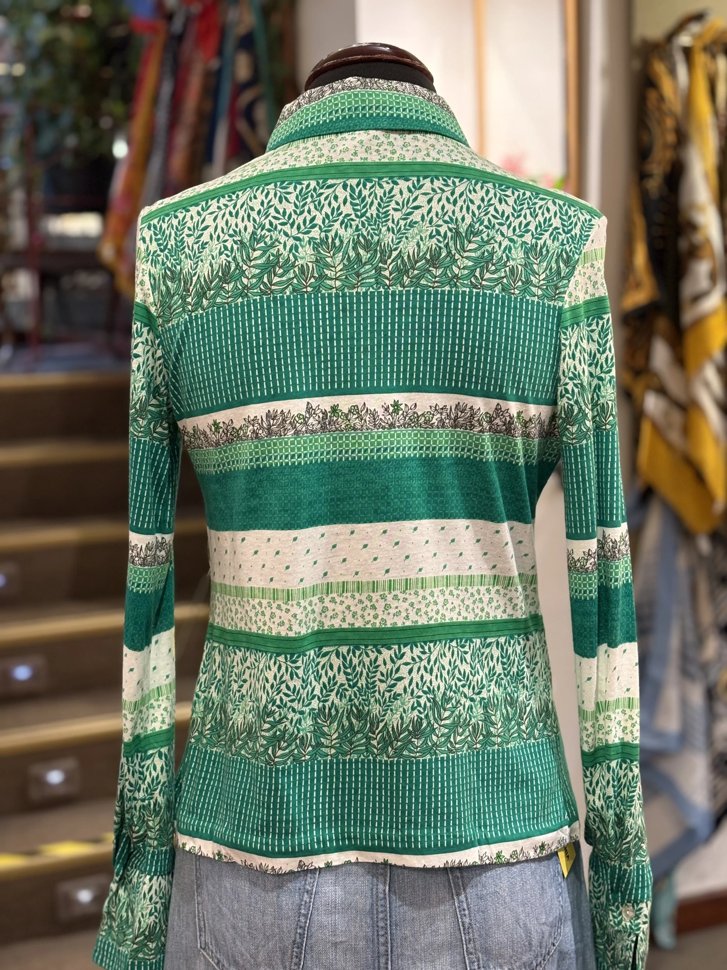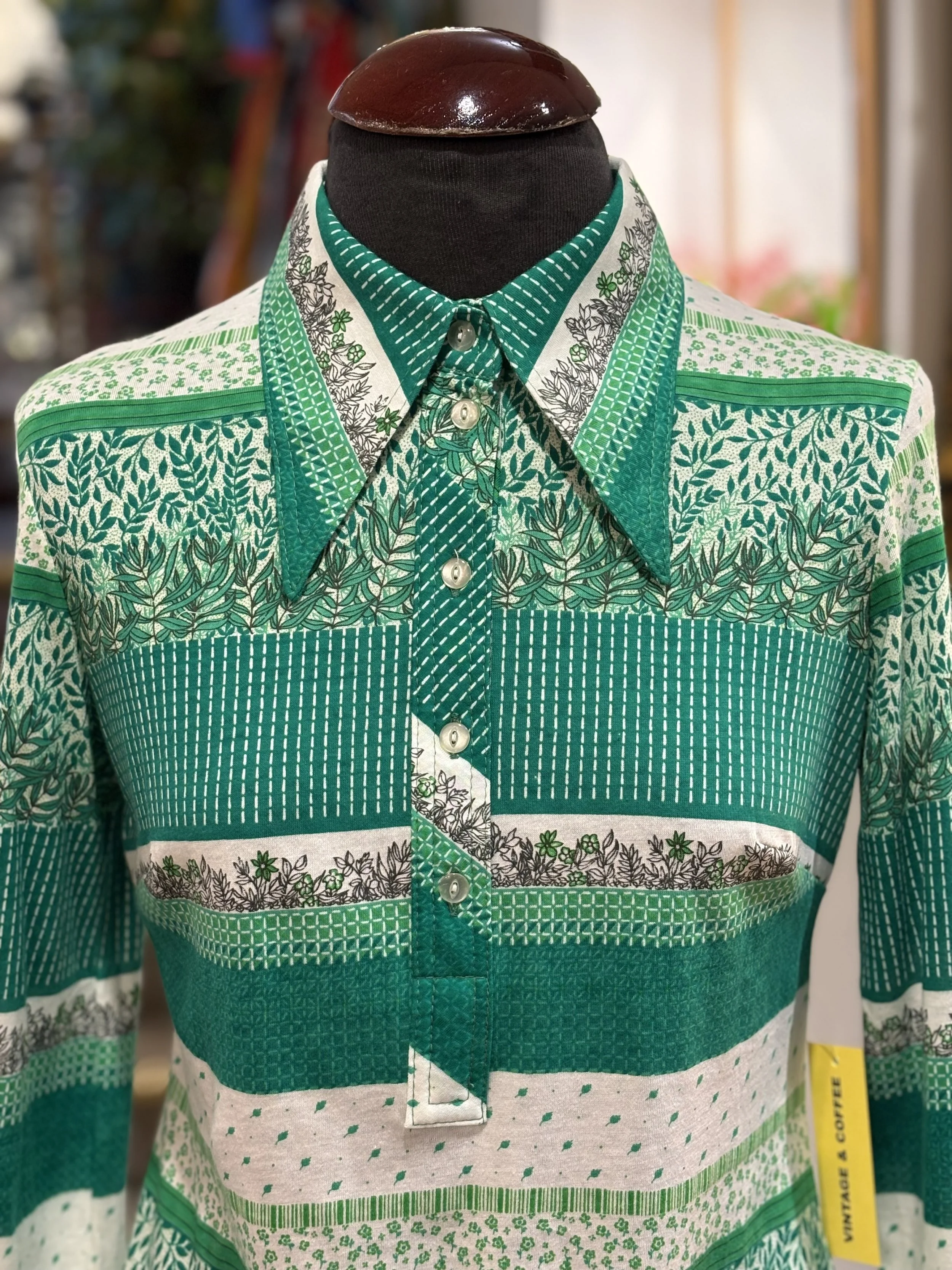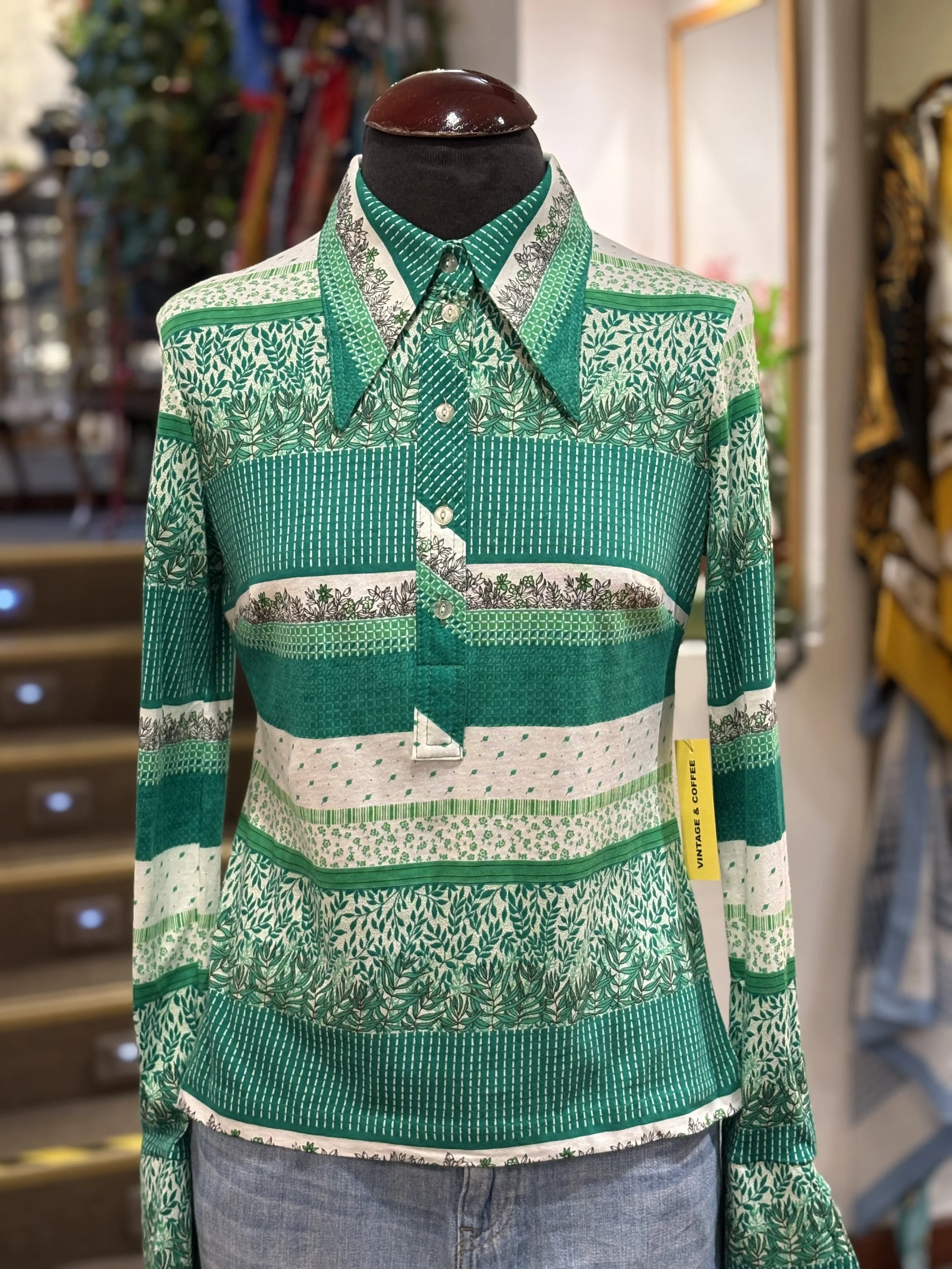 Camisa corta vintage de “TGL STOCKHOLM” de cuello grande típico de los años 70, manga larga, cierre de botones, corte entallado, estampado floreado con cuerpos de mujer en negro sobre fondo blanco crema.