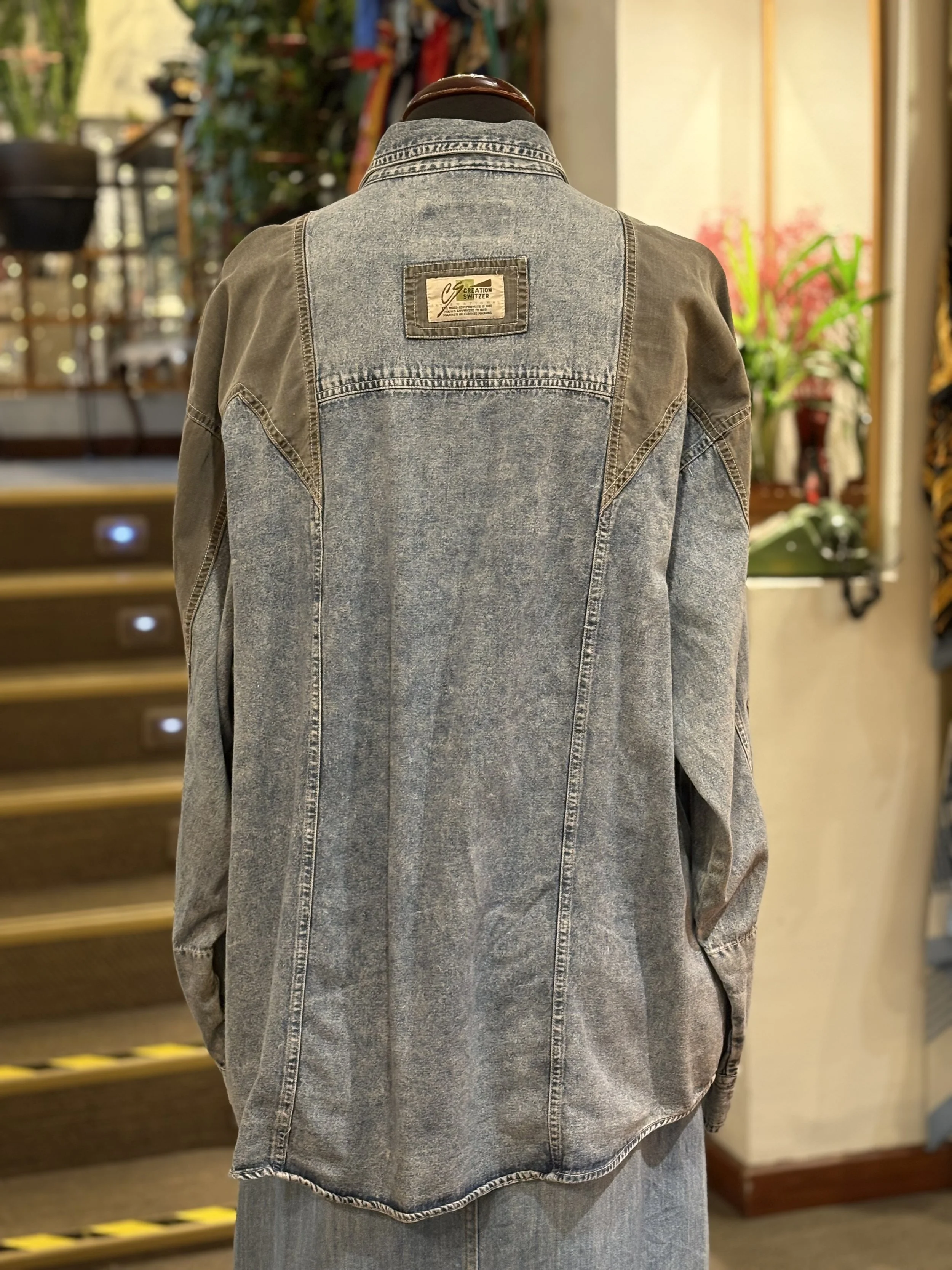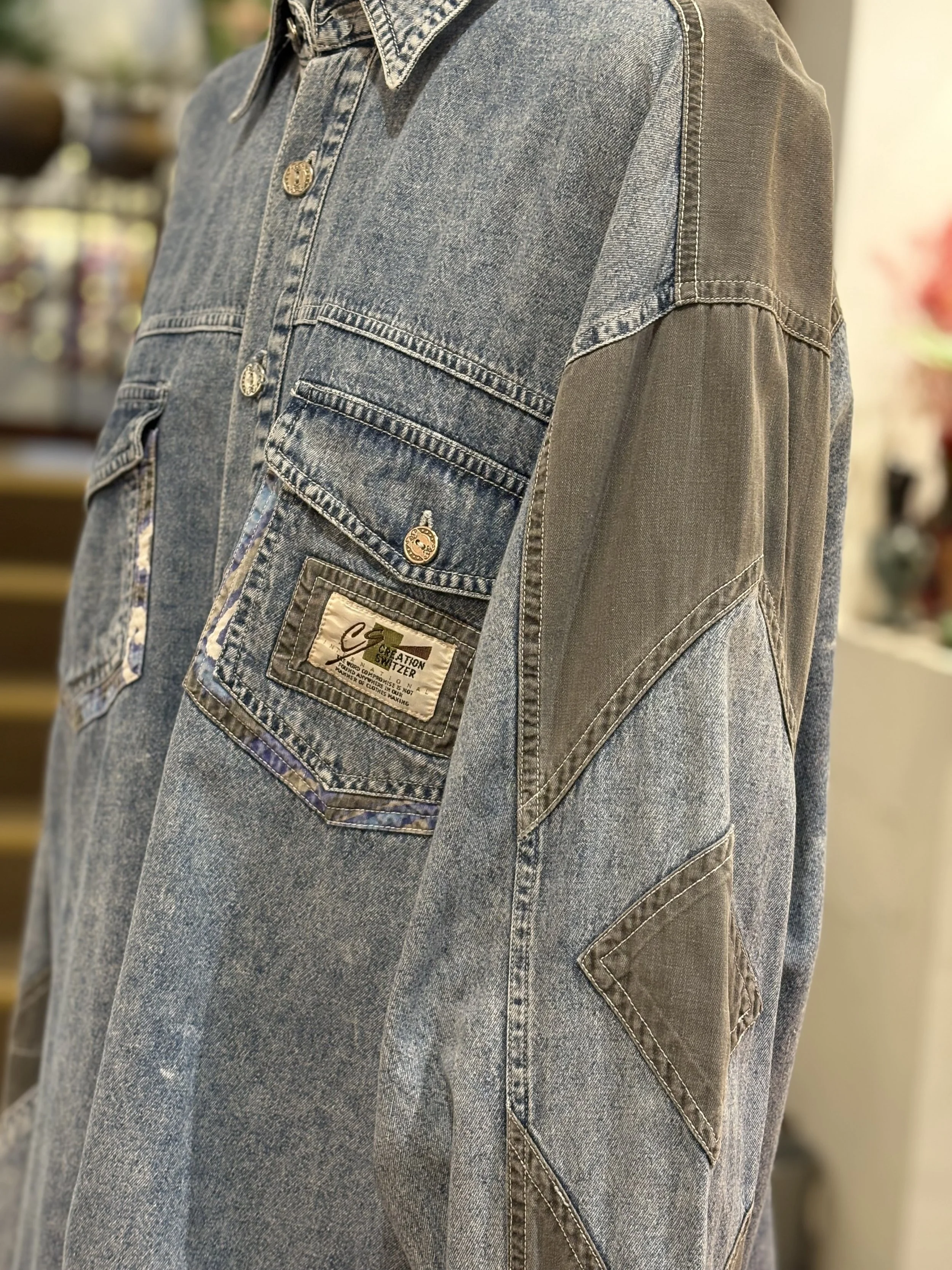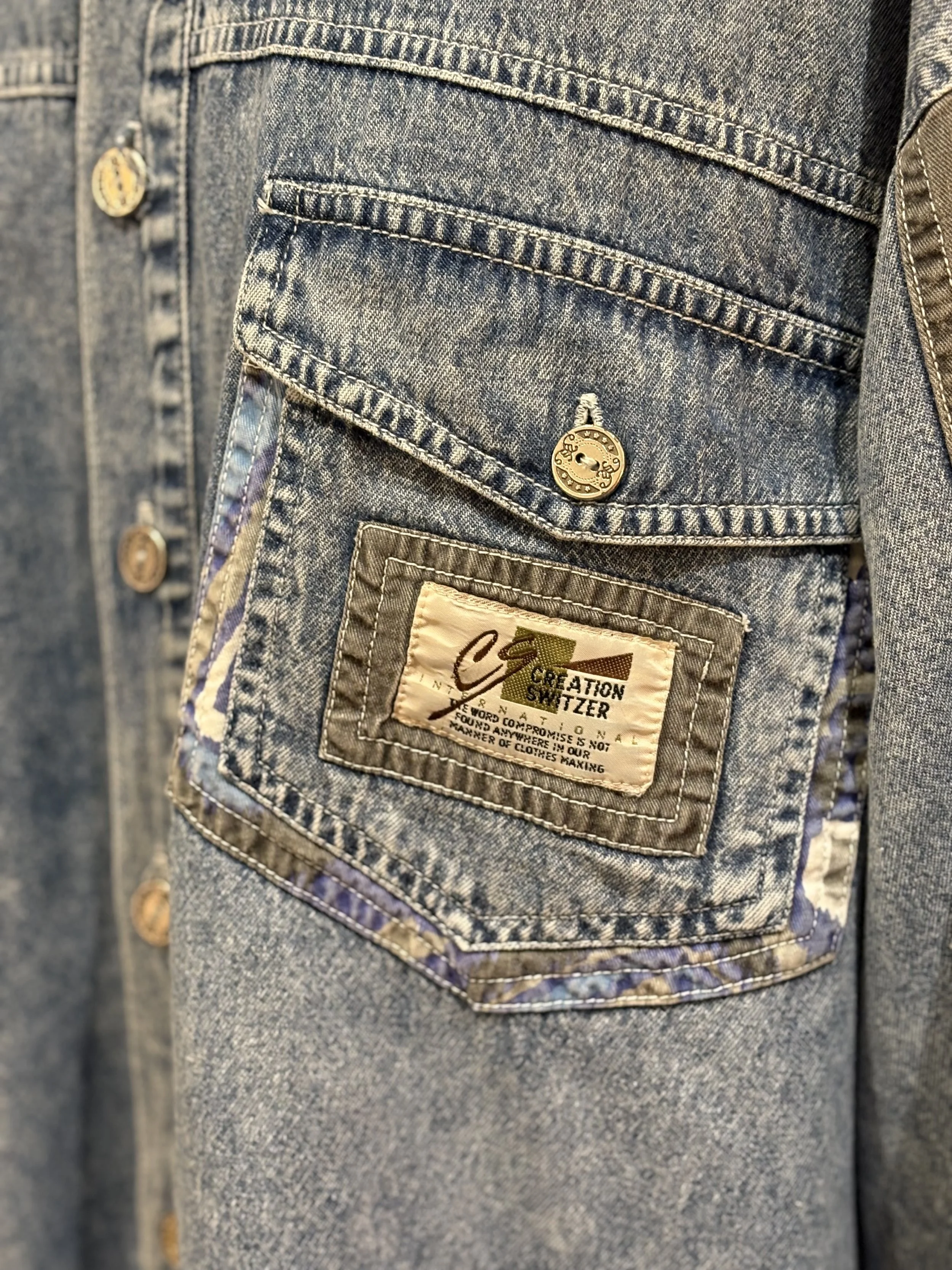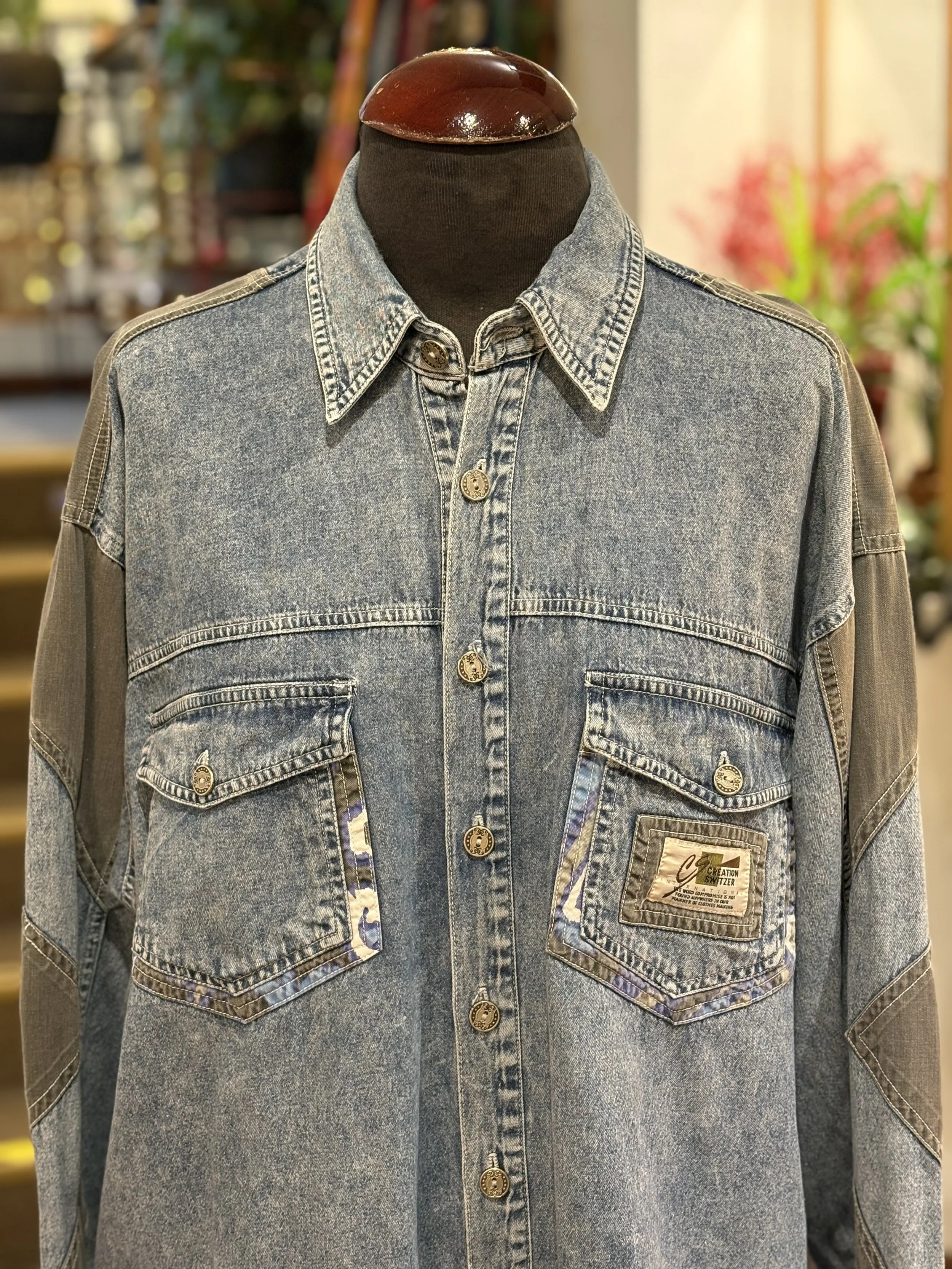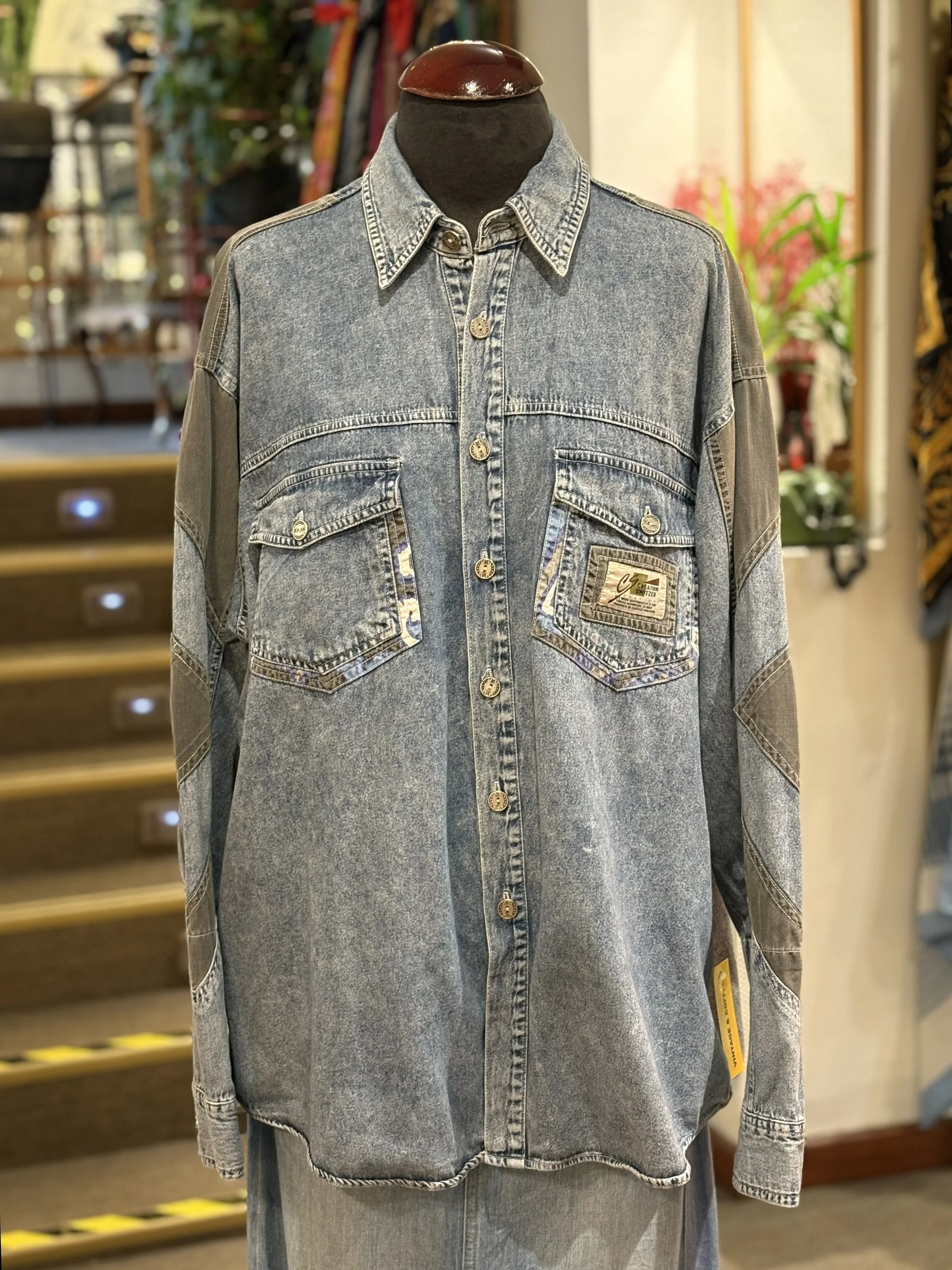 Camisa vintage “ELÉGANCE HOMME” de manga larga, cierre de botones, bolsillos con cierre de solapa en pecho, estampado multicolor de inspiración étnica en tonos mostaza, morados, verdes, azul. Tejido grueso y suave, corte unisex holgado para poder llevar abierta o cerrada, camisa o como sobrecamisa.