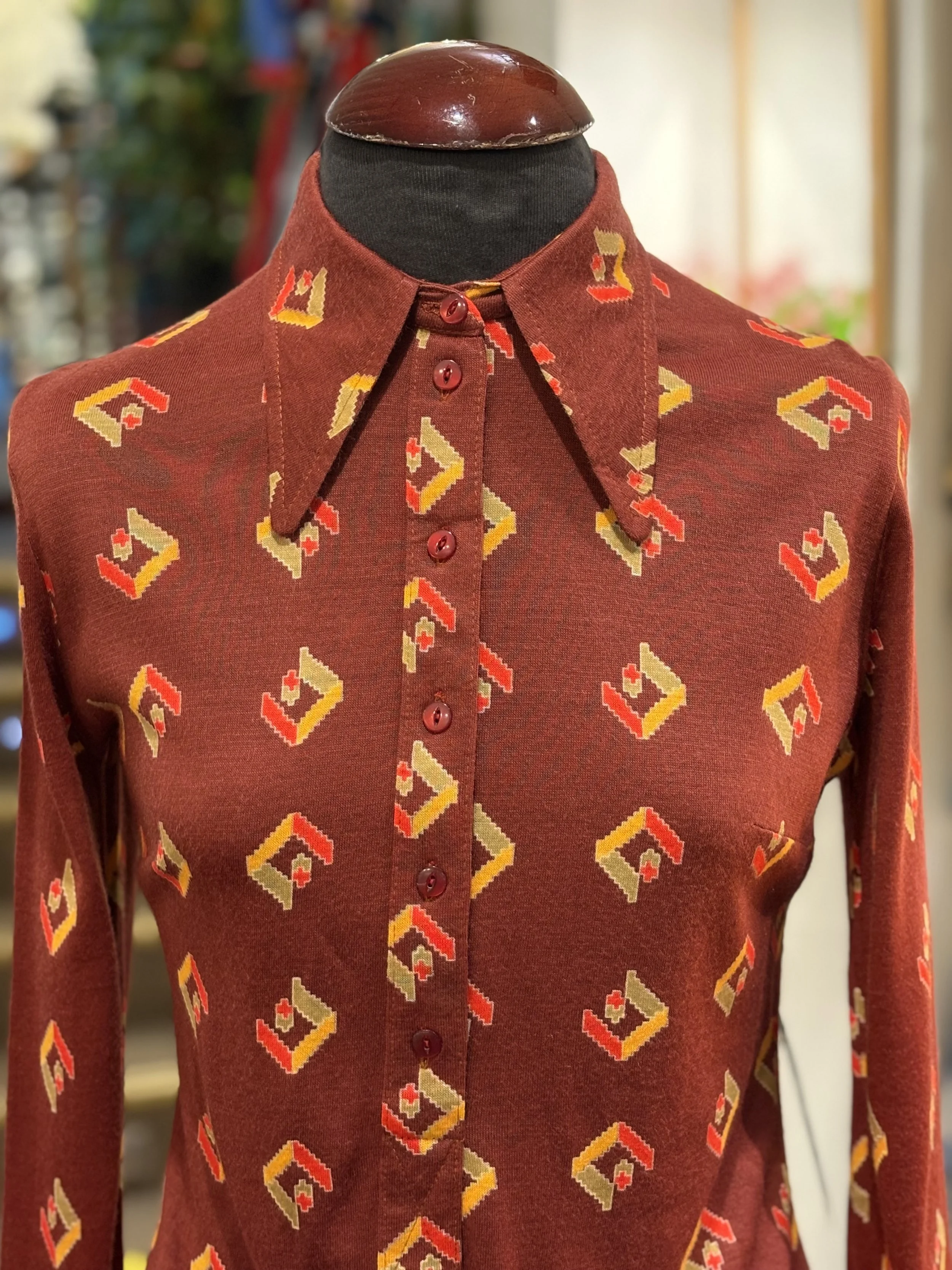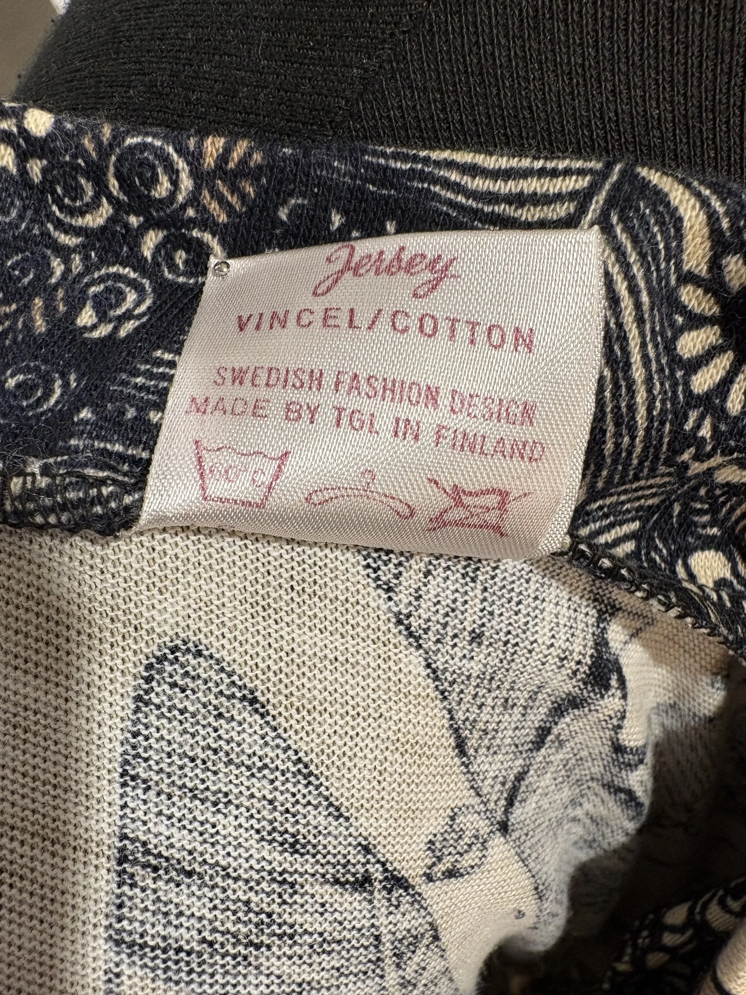 Composición 100% Vincel / cotton = el vincel fue una fibra sintética desarrollada en Suecia en los años 60 que se producía a partir de acrílicos modificados y se mezclaba con el algodón. Su objetivo era lograr tejidos más resistentes, fáciles de lavar y con menos arrugas muy en la línea de la moda práctica de los 60-70. Reflejaba la innovación textil sueca de aquella época, hoy en día ya no se utiliza.