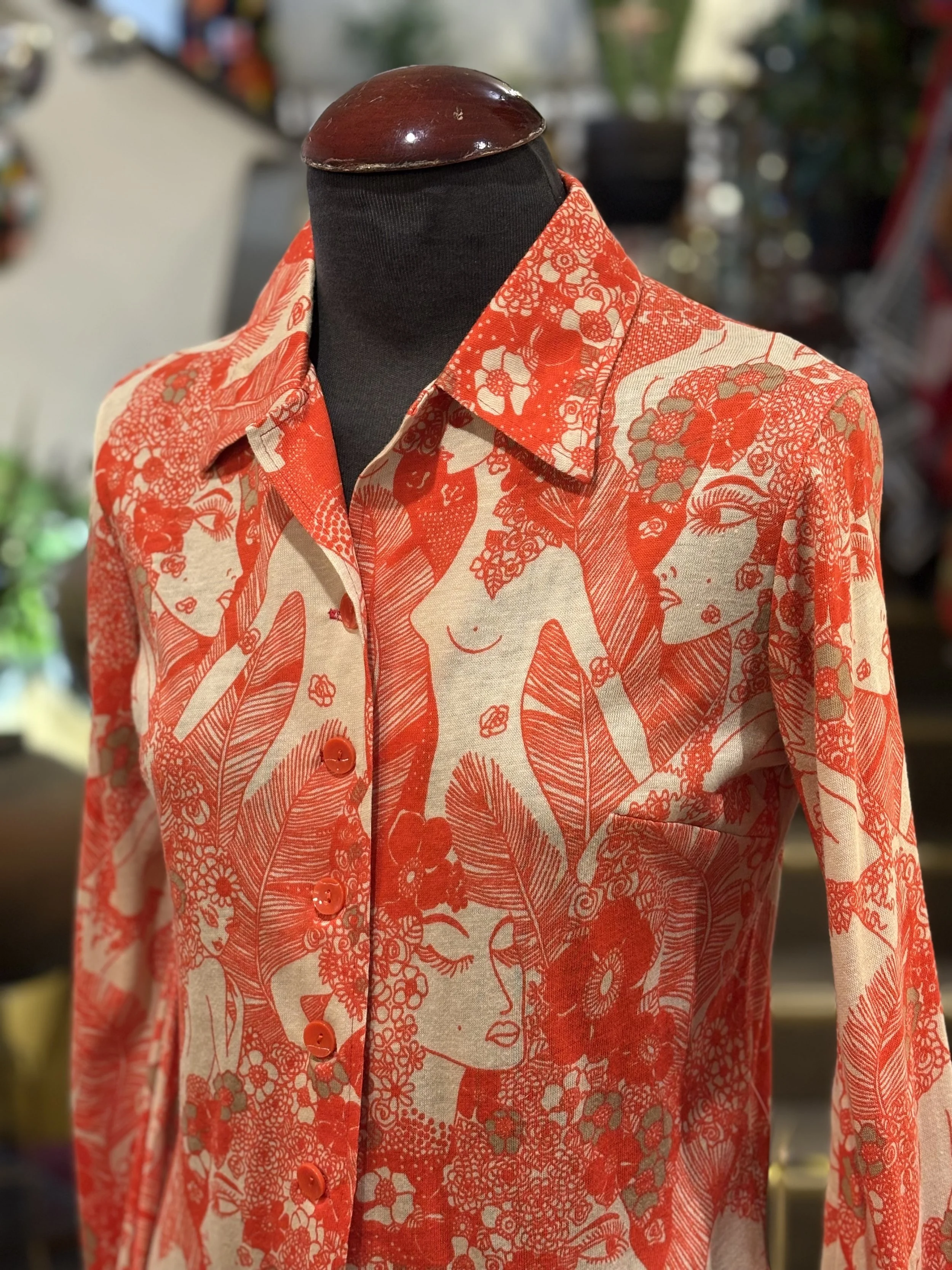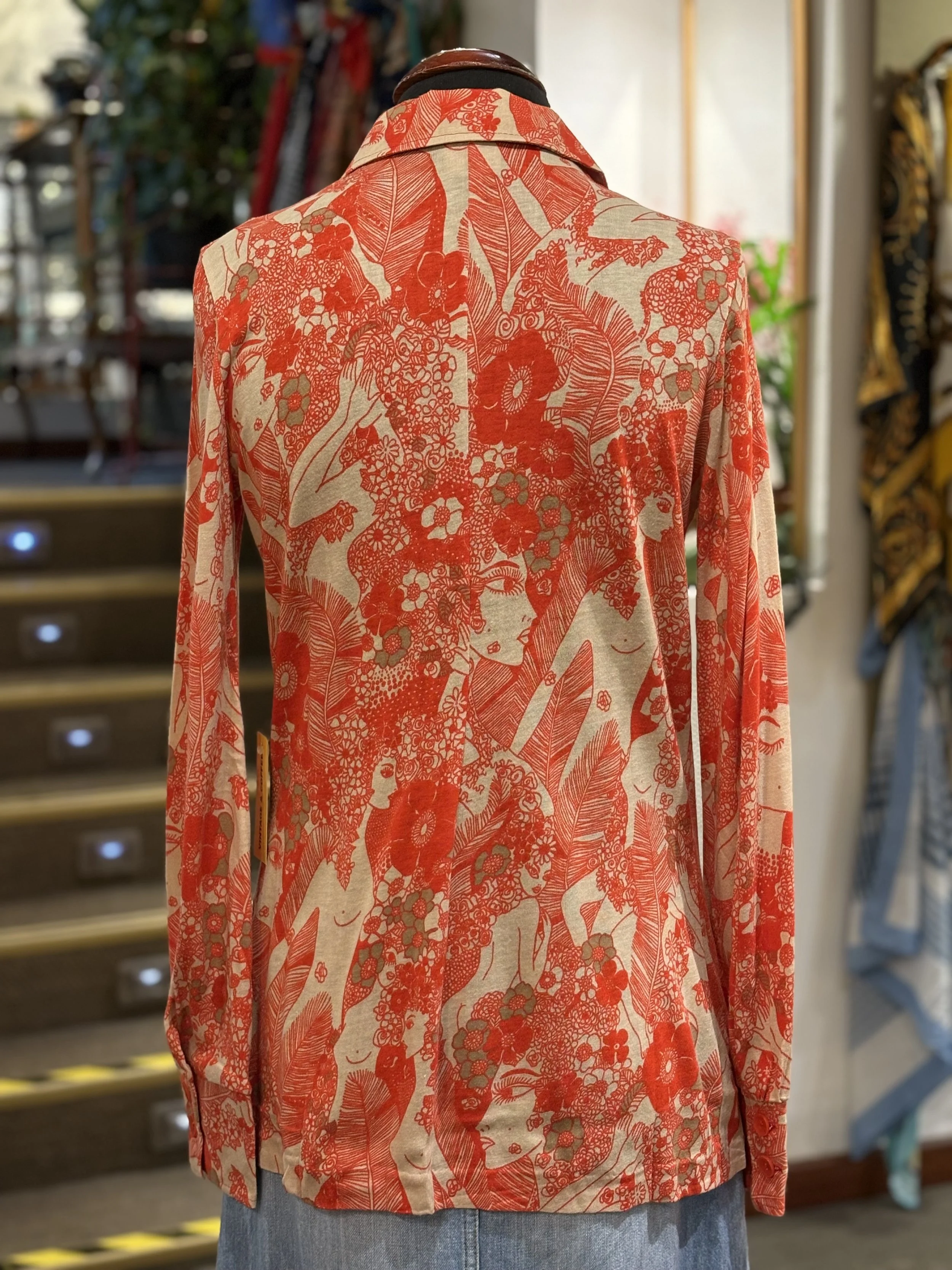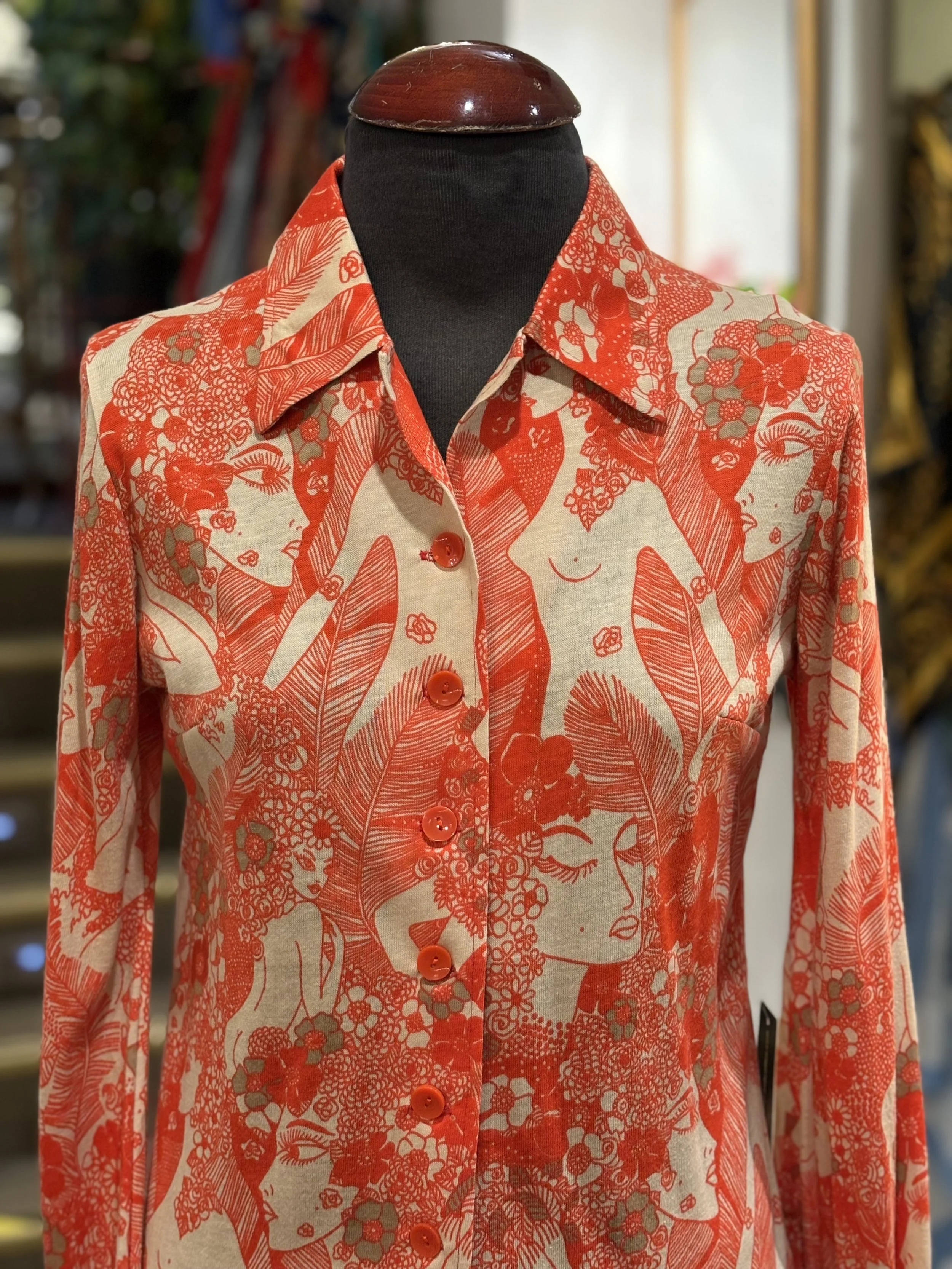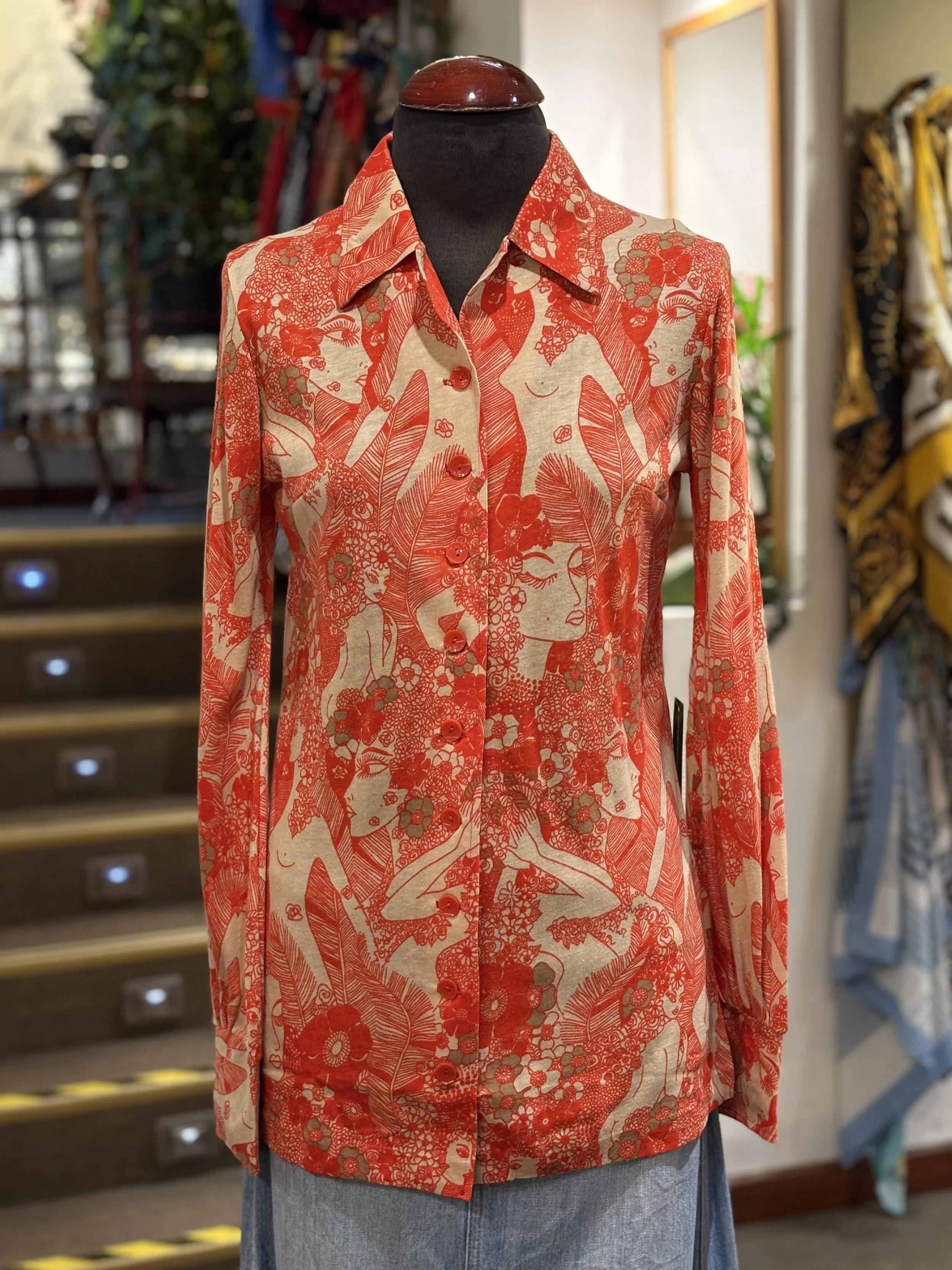 Camisa polera vintage de “TGL STOCKHOLM” de cuello grande típico de los años 70, manga larga, cierre de cinco botones hasta el final del pecho, corte entallado, estampado floreado psicodélico en tonos coral sobre fondo blanco.