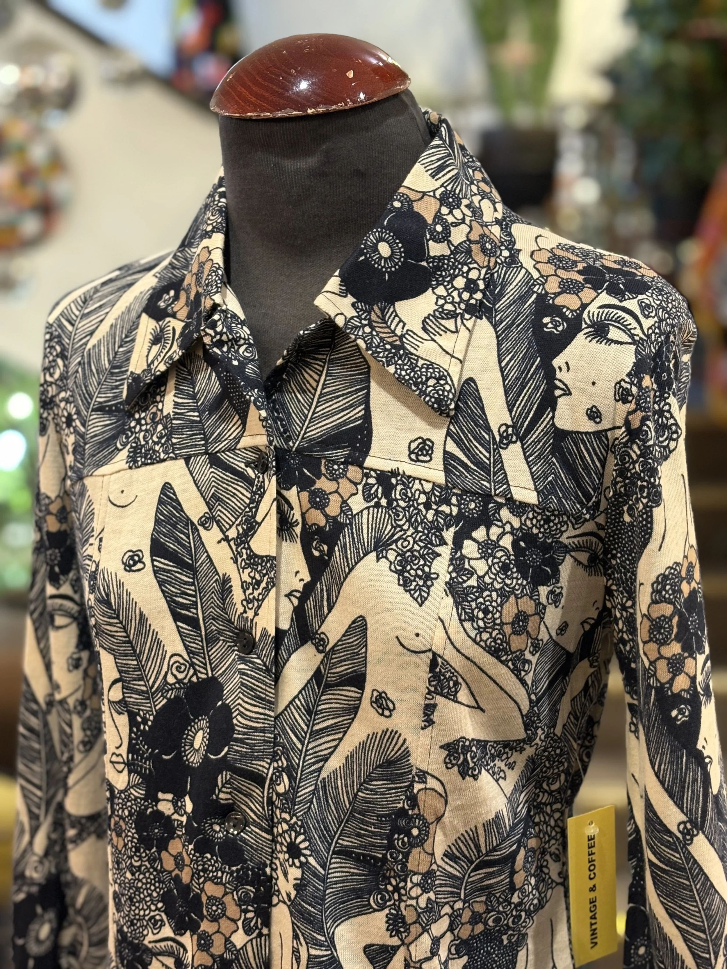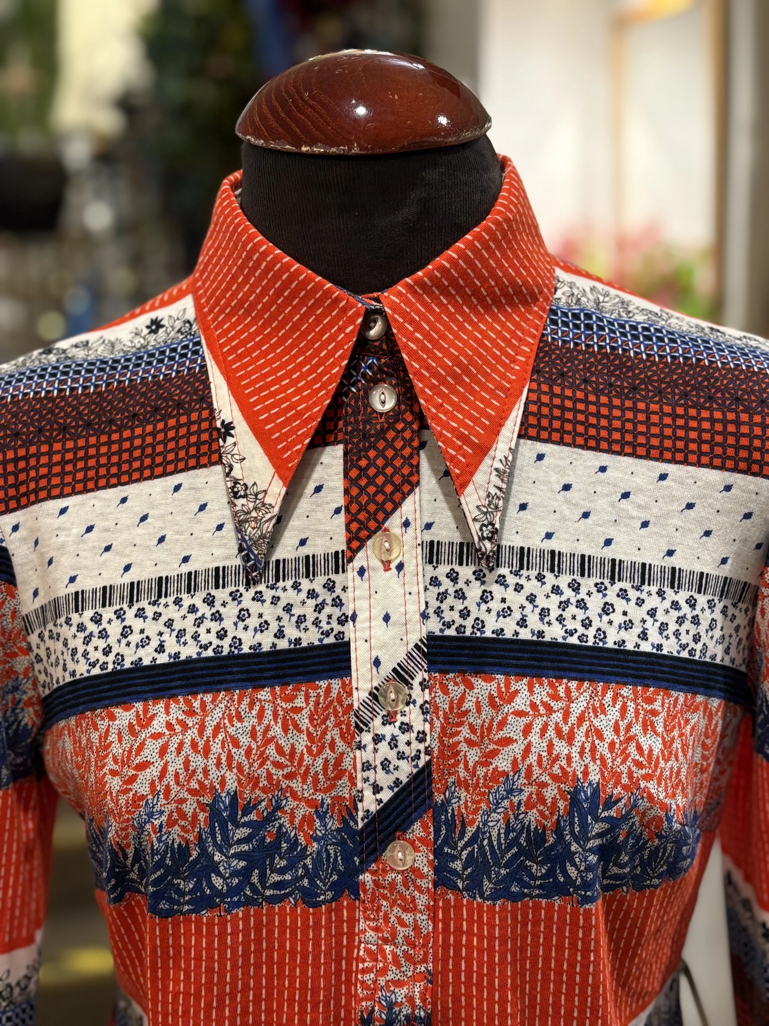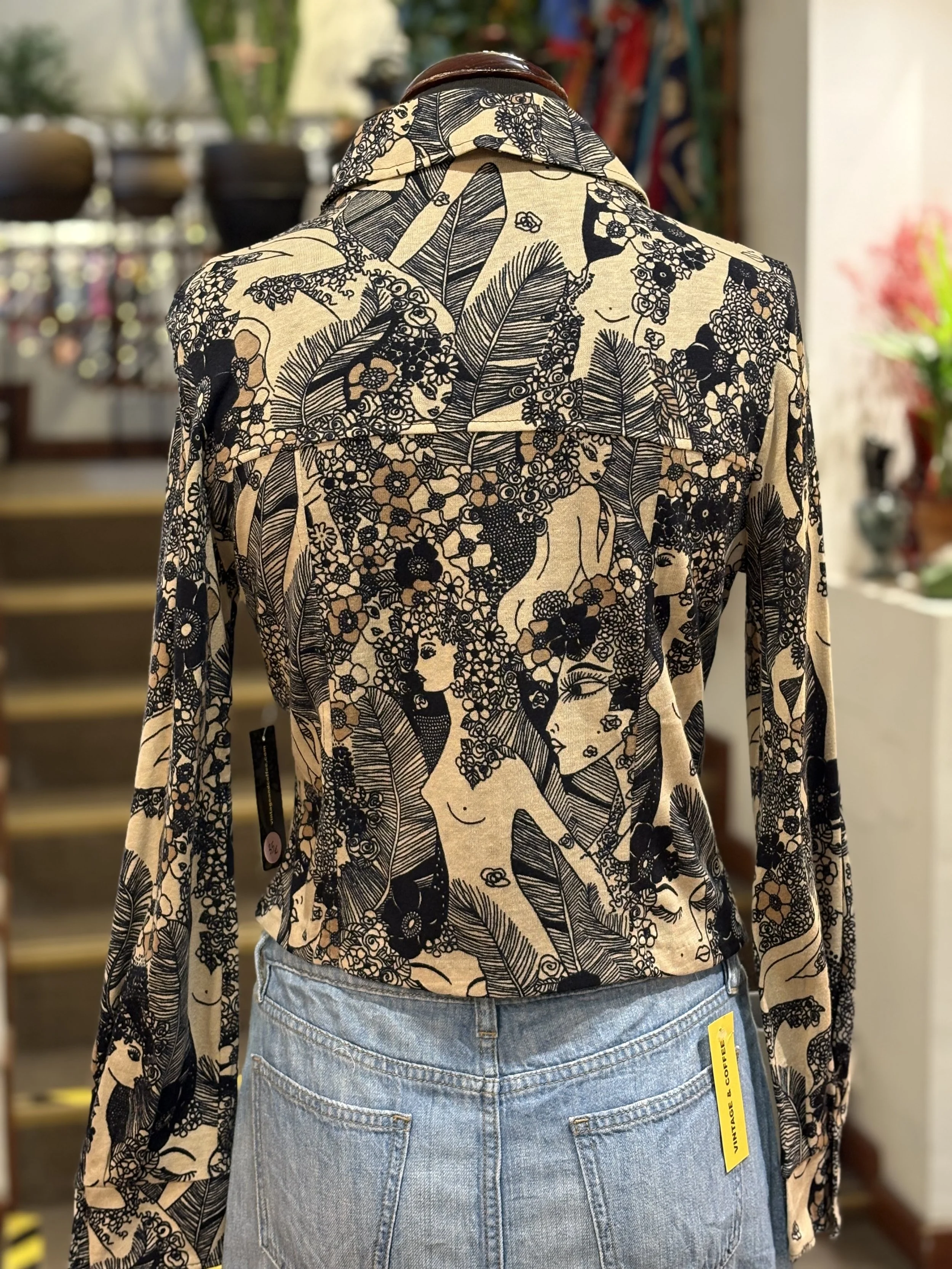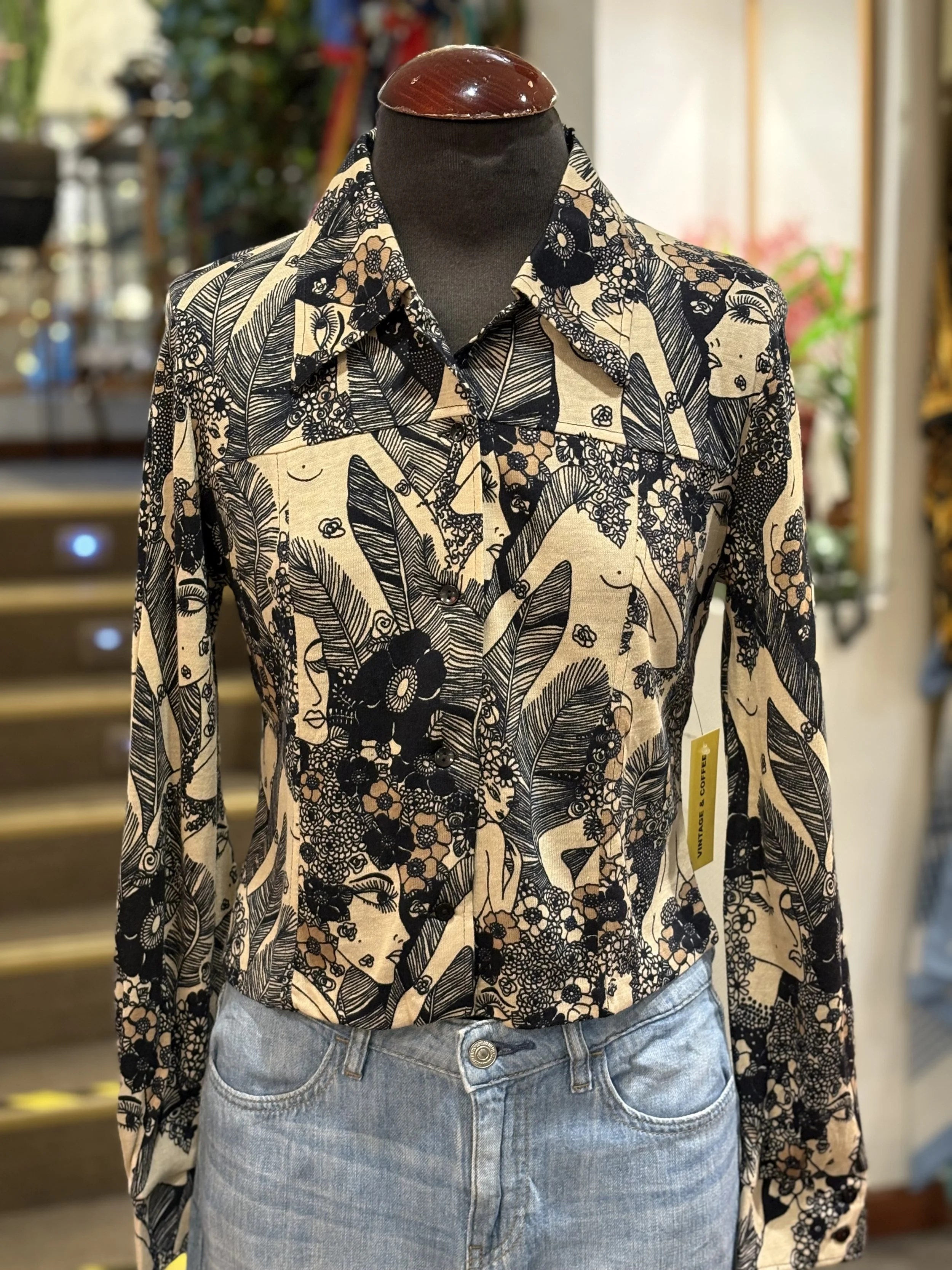 Camisa polera vintage de “TGL STOCKHOLM” de cuello grande típico de los años 70, manga larga, cierre de cinco botones hasta el final del pecho, corte entallado, estampado floreado psicodélico en tonos coral sobre fondo blanco.