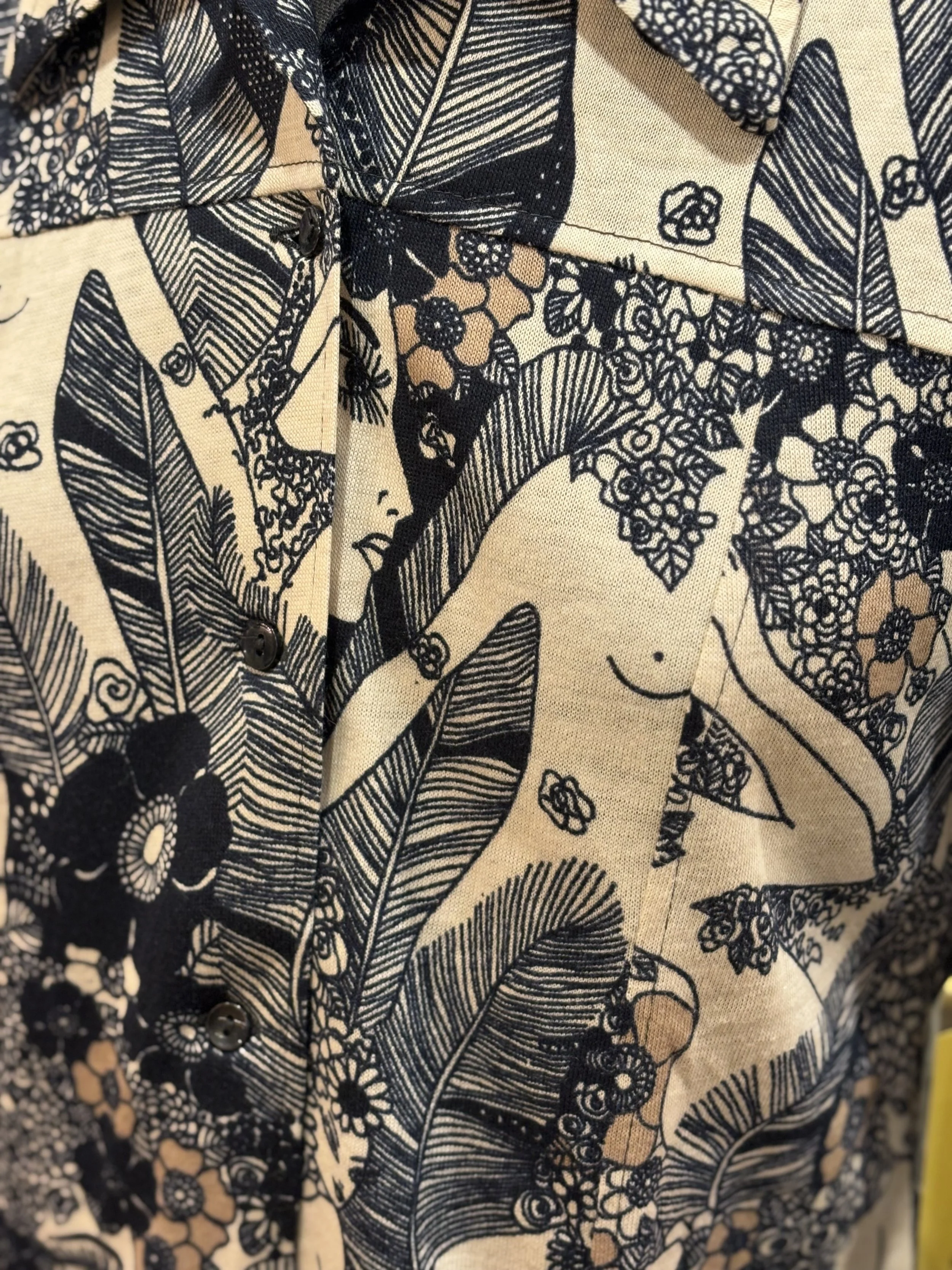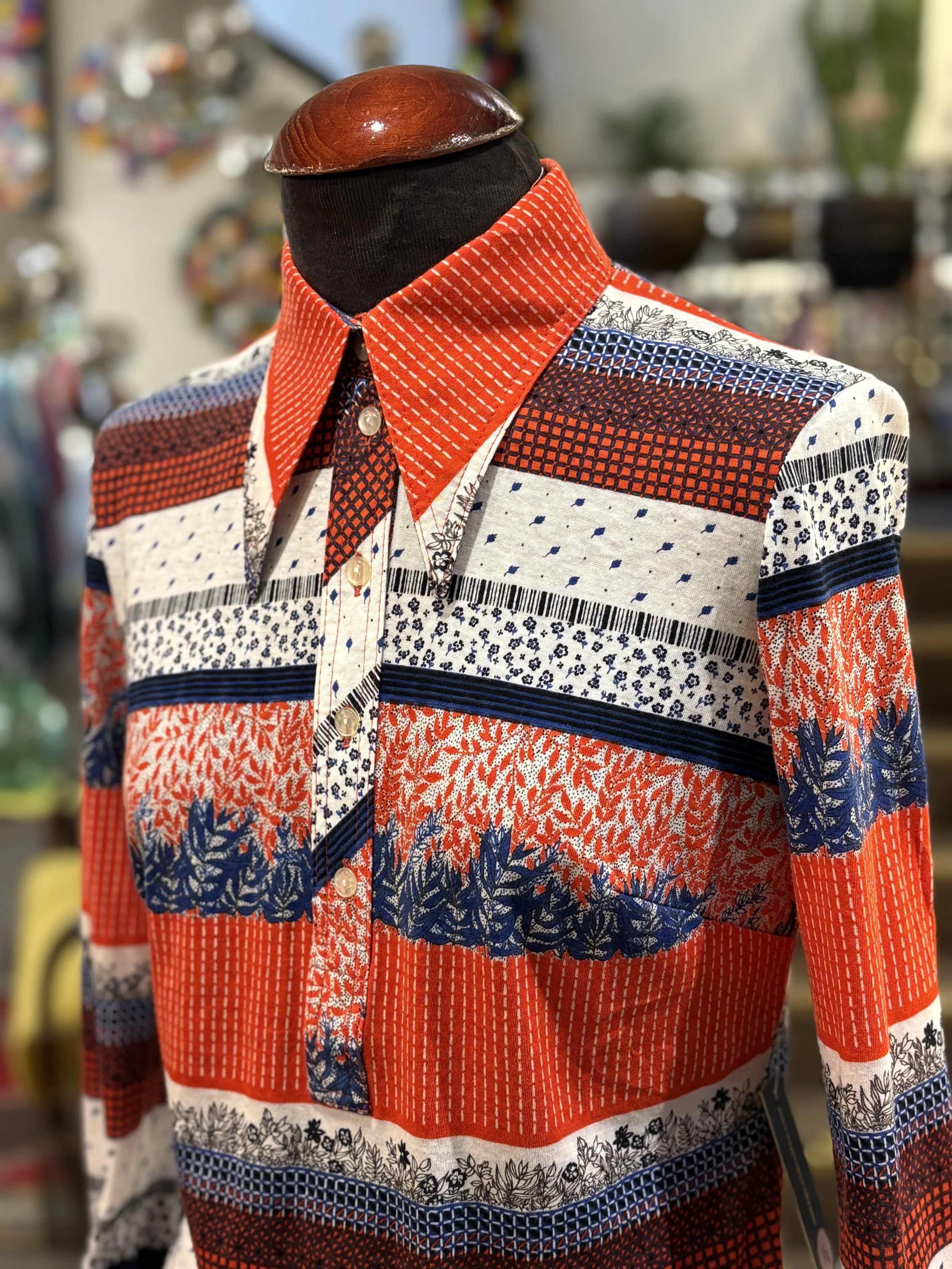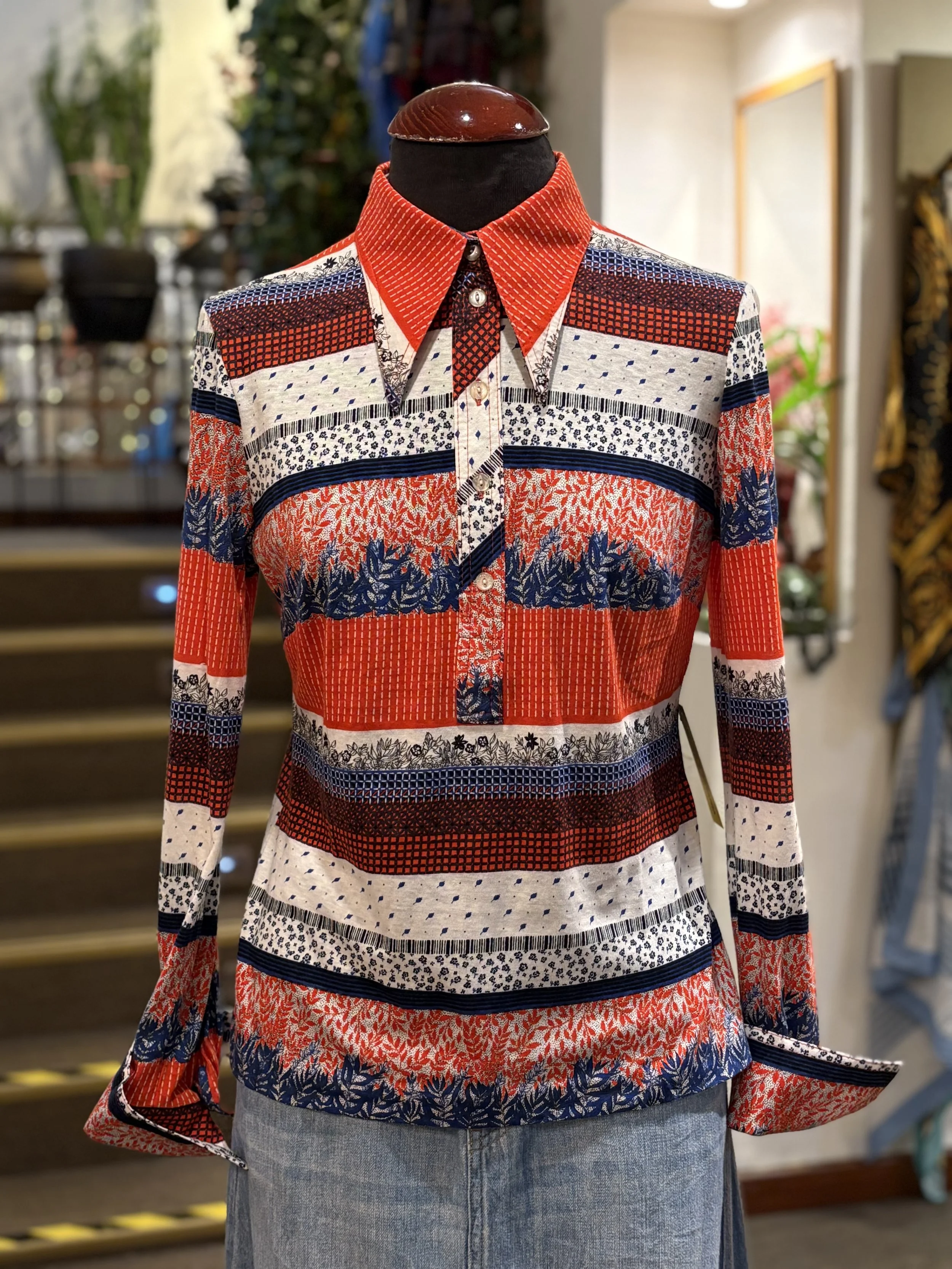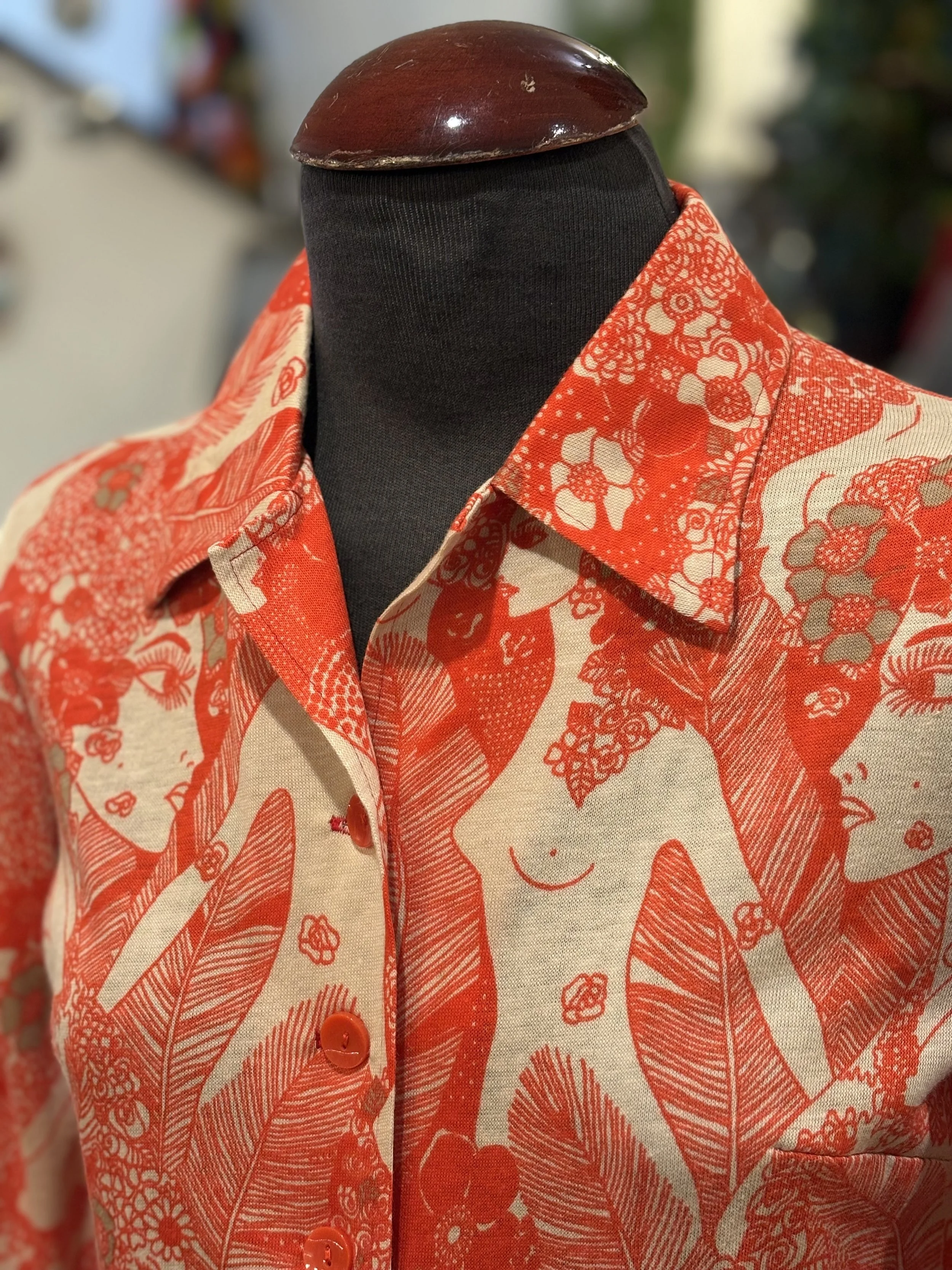 Camisa polera vintage de “TGL STOCKHOLM” de cuello grande típico de los años 70, manga larga, cierre de cinco botones hasta el final del pecho, corte entallado, estampado floreado psicodélico en tonos coral sobre fondo blanco.