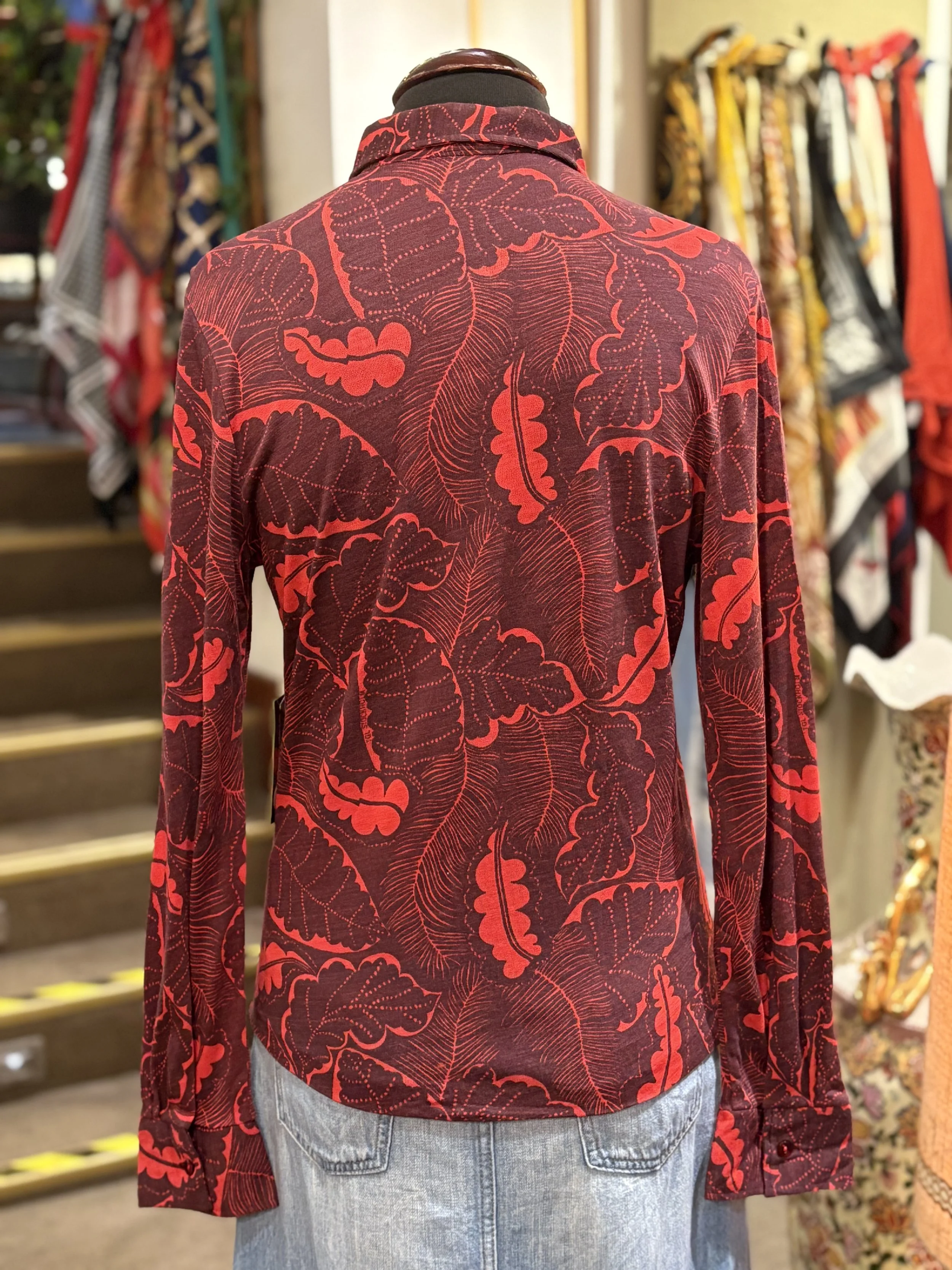Camisa polera vintage de “TGL STOCKHOLM” de cuello grande típico de los años 70, manga larga con cierre de dos botones, cierre de seis botones hasta el final del pecho, corte entallado, estampado figuras geométricas sobre fondo burdeos.