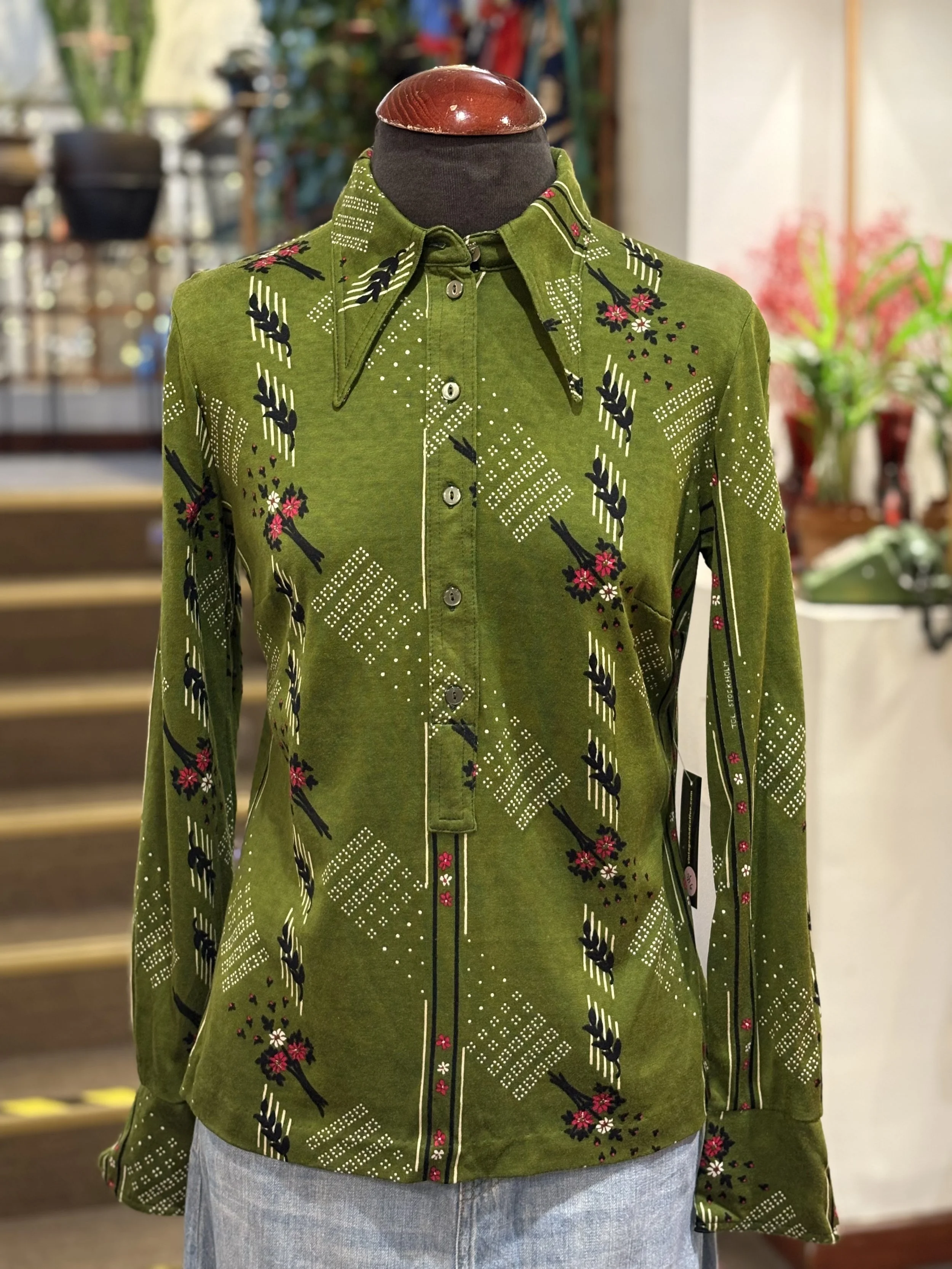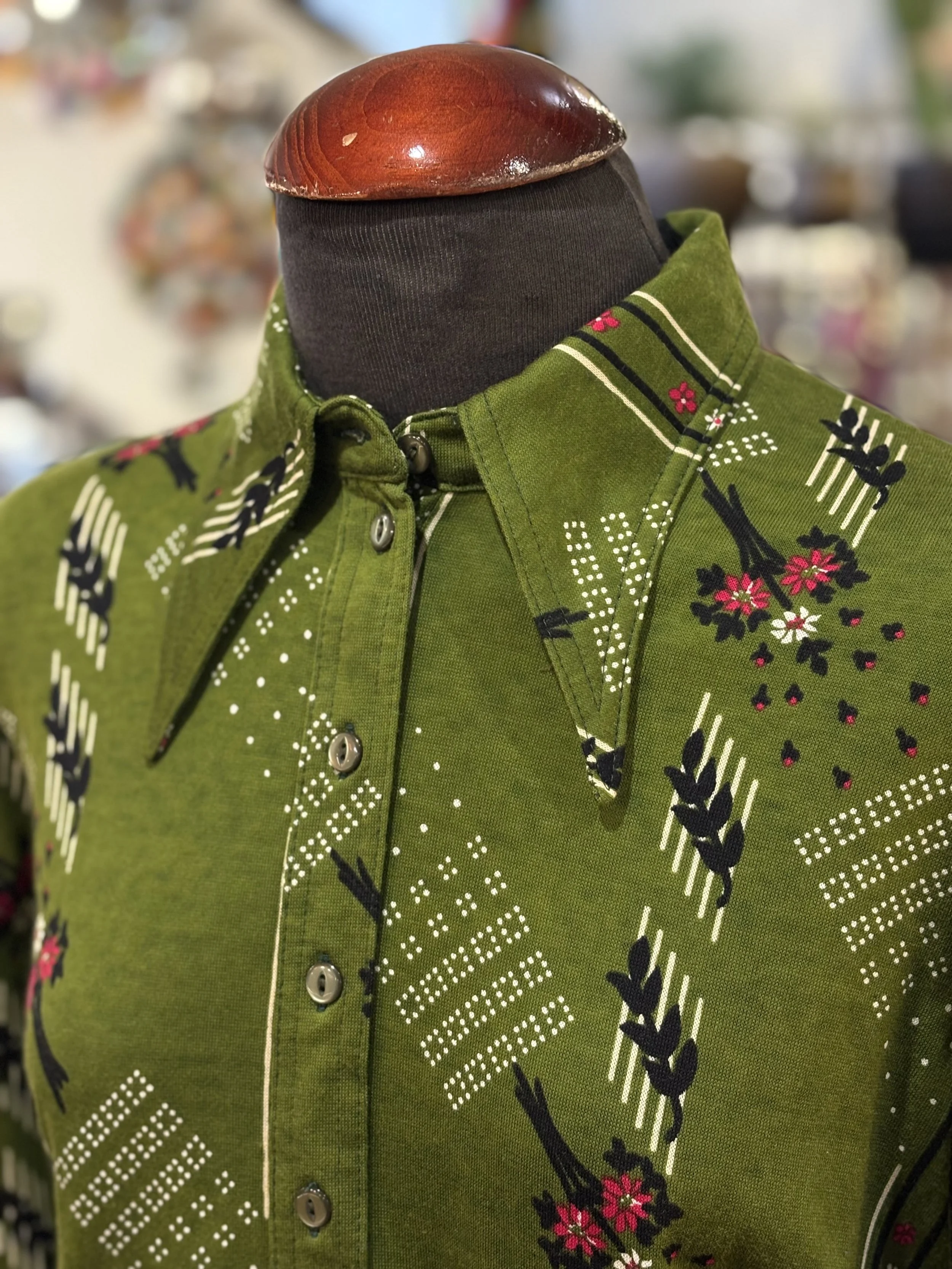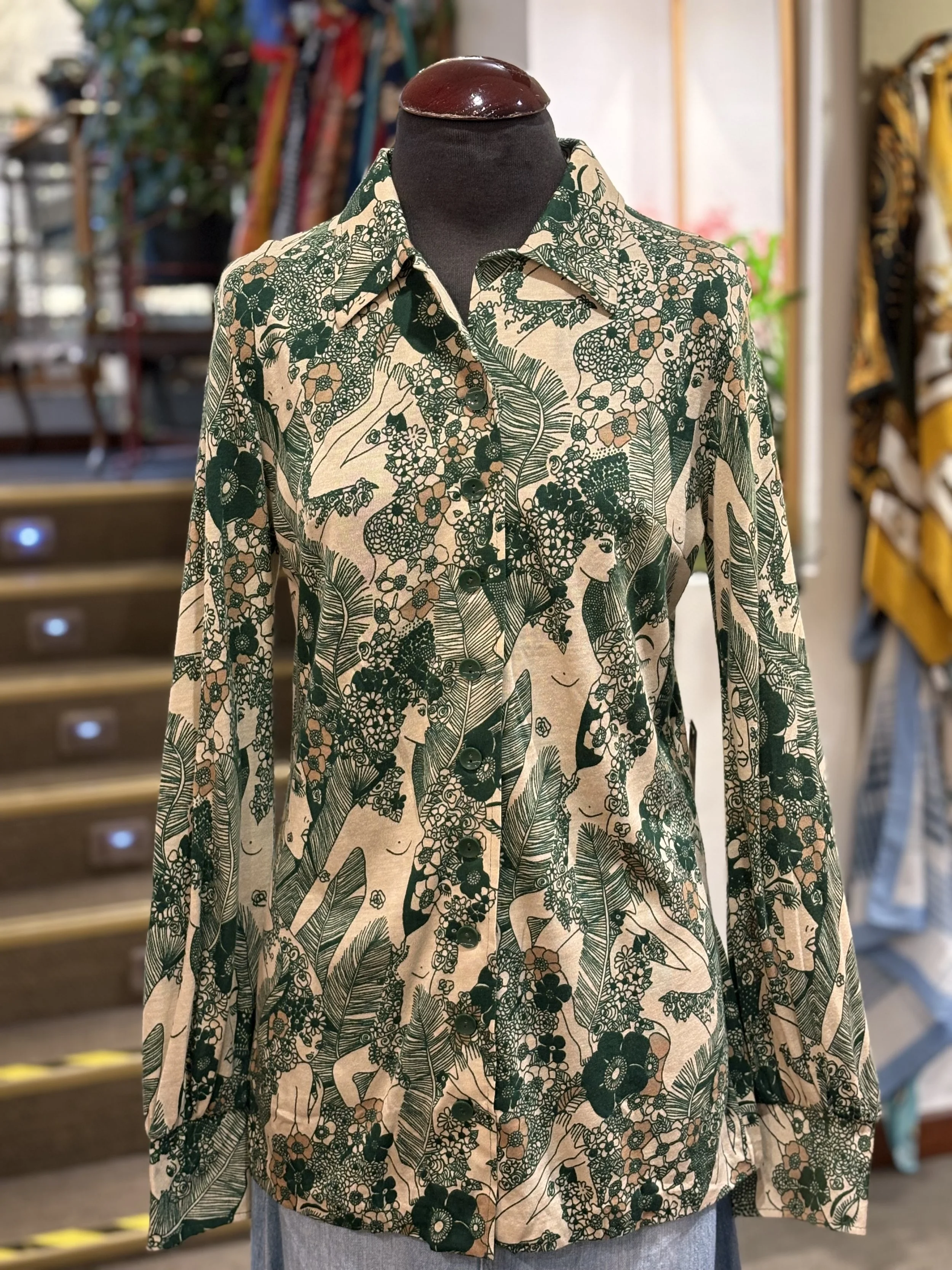 Camisa polera vintage de “TGL STOCKHOLM” de cuello grande típico de los años 70, manga corta, cierre de seis botones hasta el final del pecho, corte entallado, estampado de paraguas multicolor sobre fondo blanco crema.