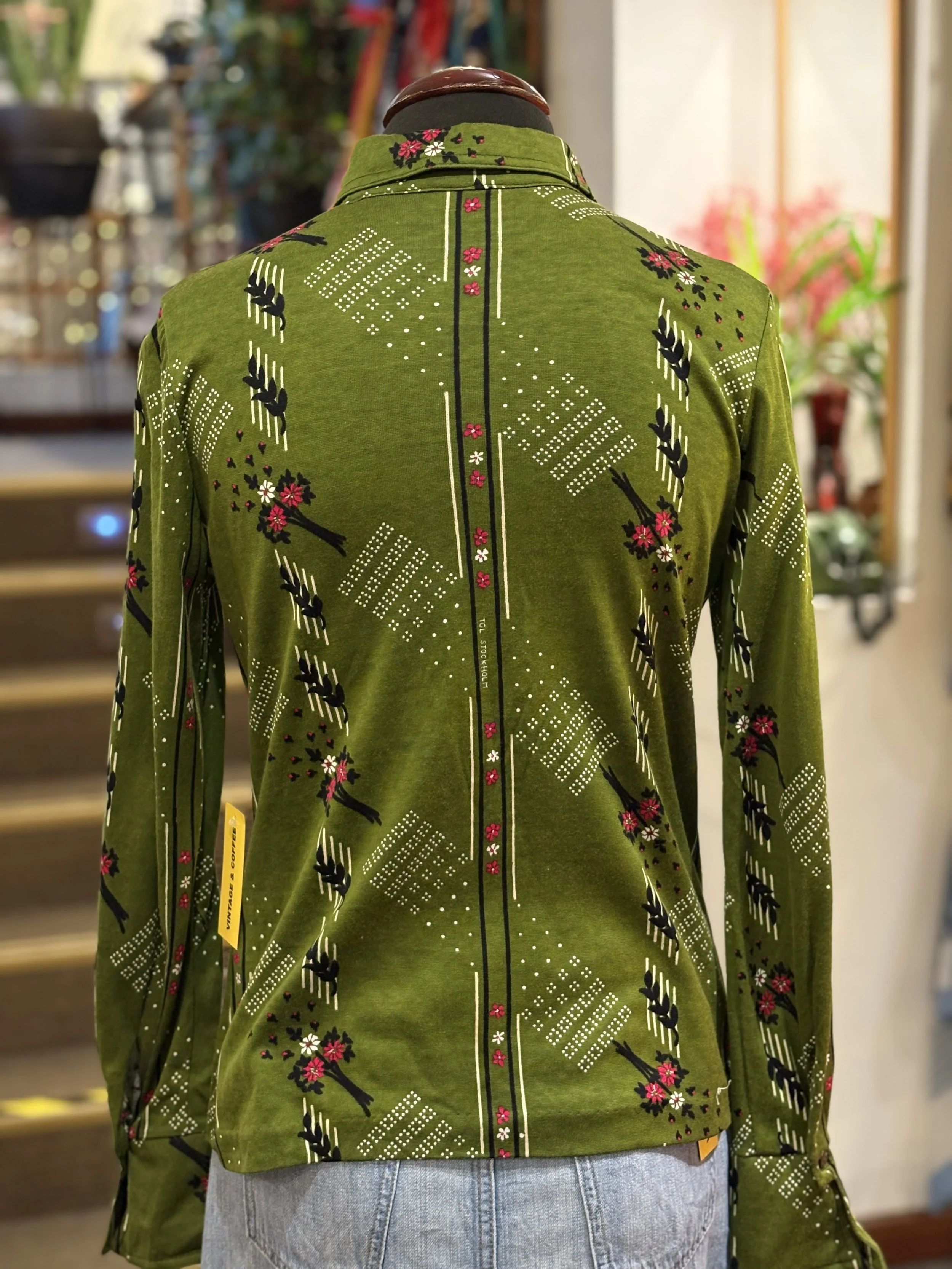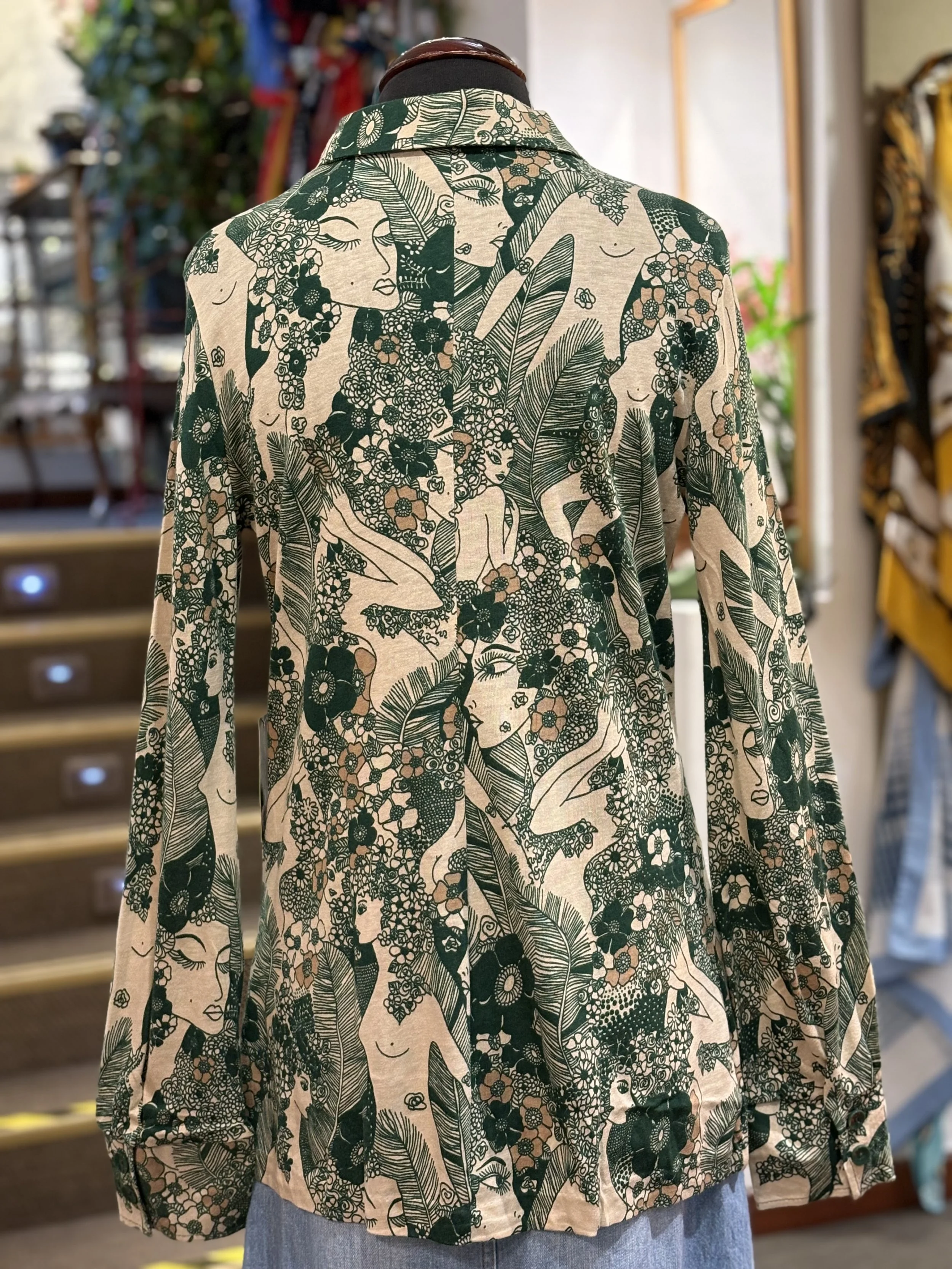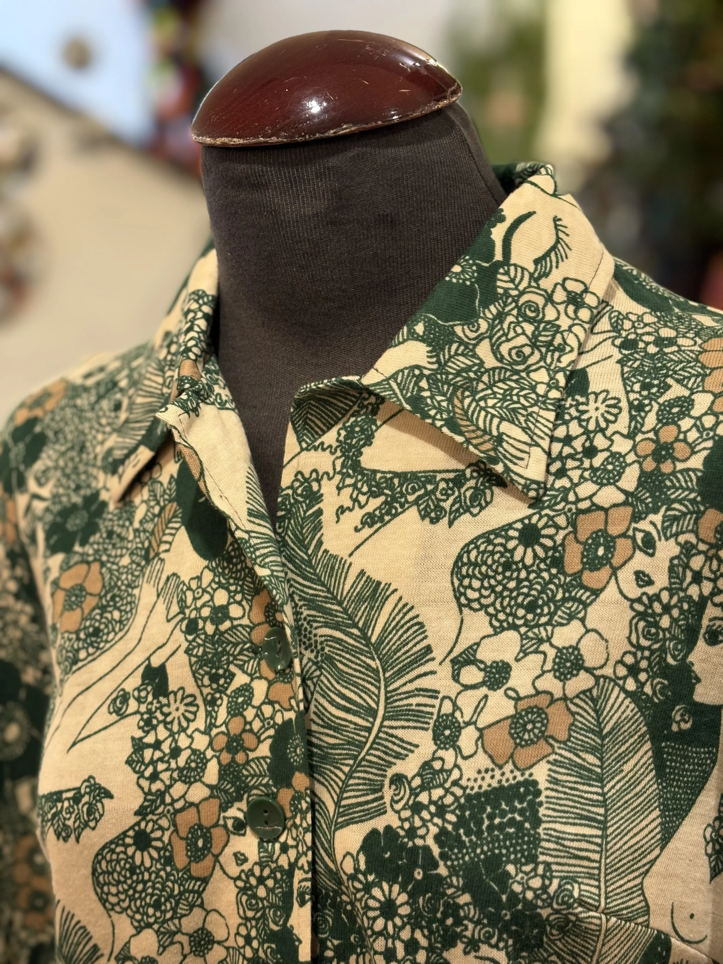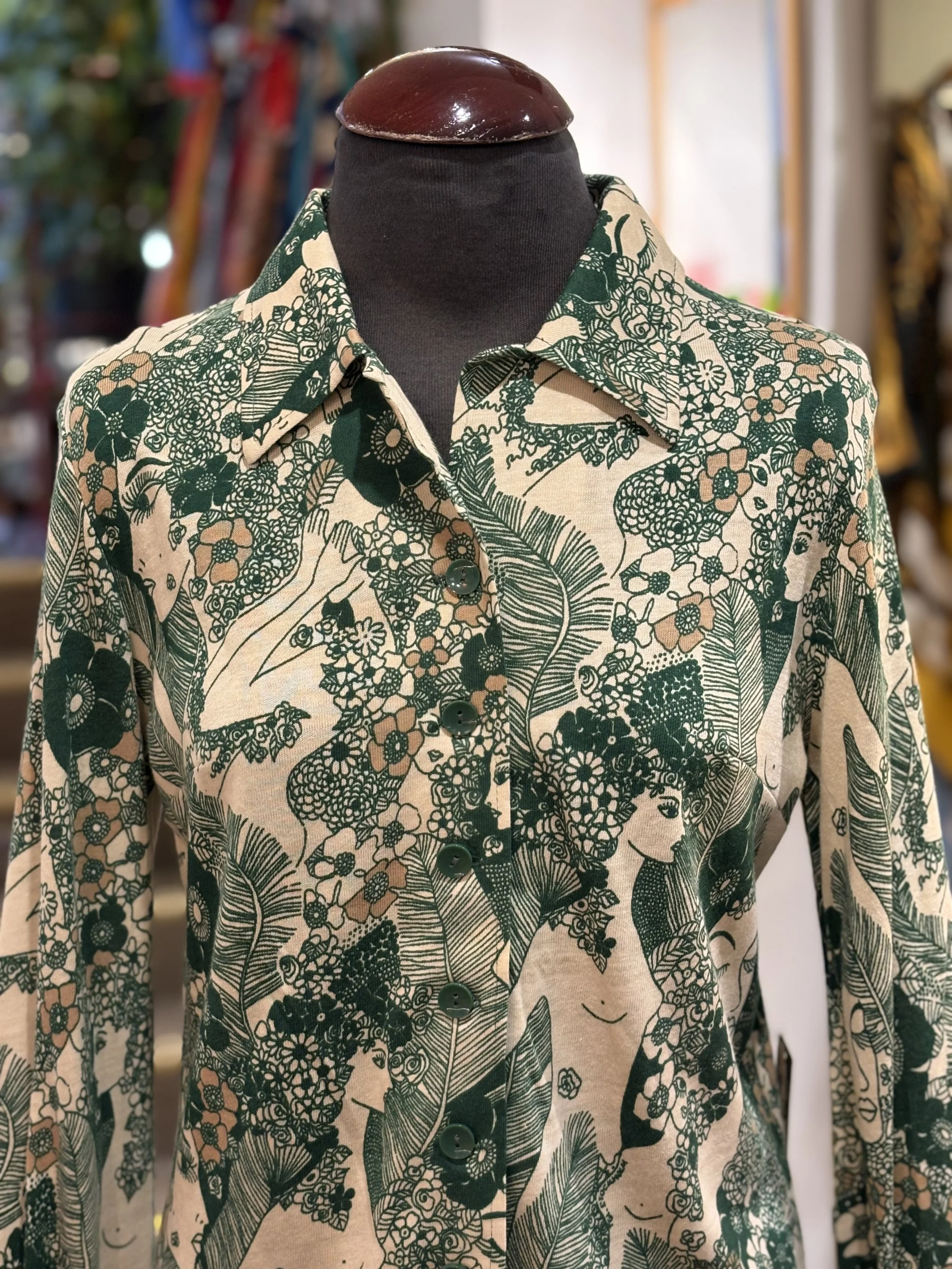 Camisa polera vintage de “TGL STOCKHOLM” de cuello grande típico de los años 70, manga corta, cierre de seis botones hasta el final del pecho, corte entallado, estampado de paraguas multicolor sobre fondo blanco crema.