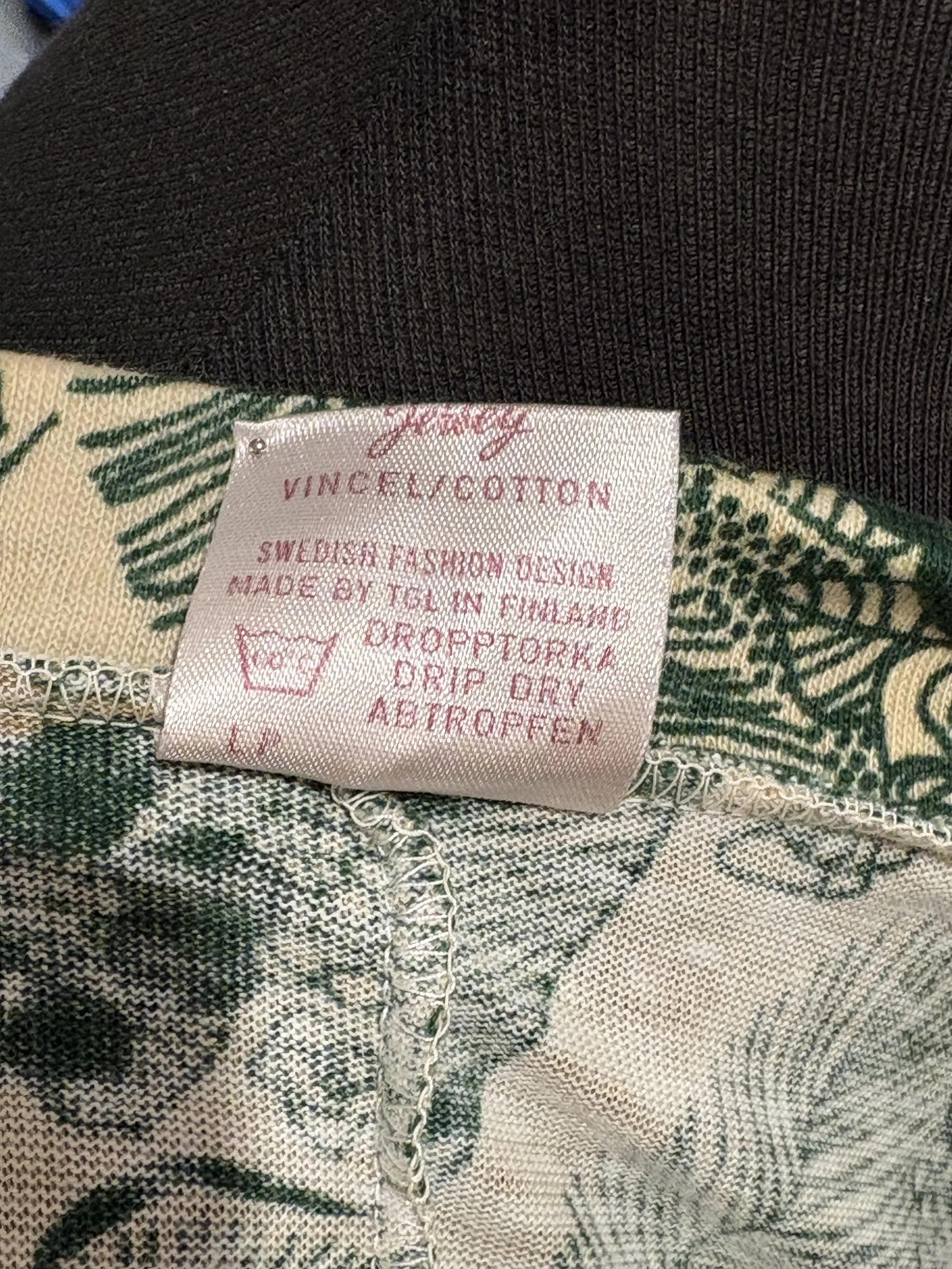 Composición 100% Vincel / cotton = el vincel fue una fibra sintética desarrollada en Suecia en los años 60 que se producía a partir de acrílicos modificados y se mezclaba con el algodón. Su objetivo era lograr tejidos más resistentes, fáciles de lavar y con menos arrugas muy en la línea de la moda práctica de los 60-70. Reflejaba la innovación textil sueca de aquella época, hoy en día ya no se utiliza.